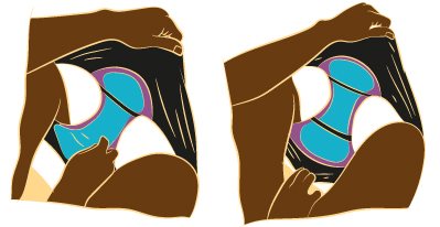 The widest part of the removable insert is placed towards the back of the underwear. Simply slide it under the front elastic, then to the back. The insert should not protrude beyond the waterproof purple part of the underwear.