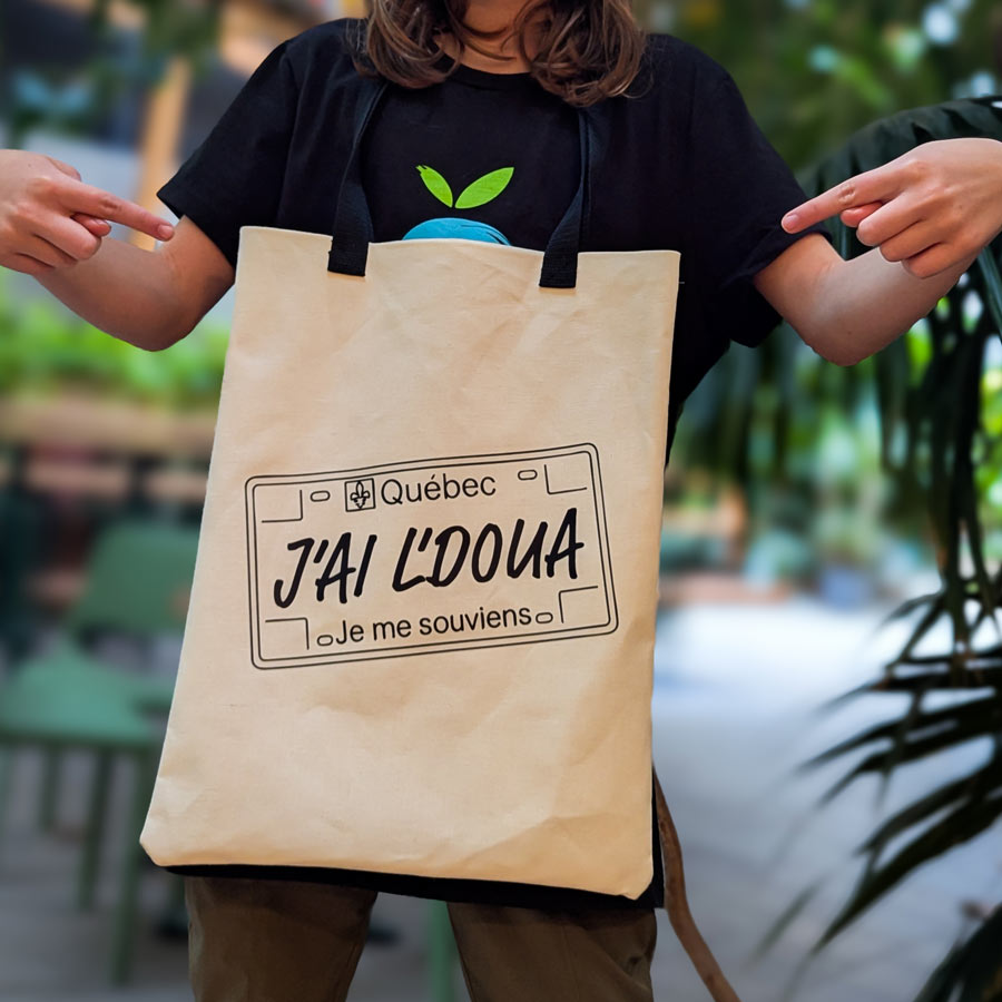 The “J’ai L’DOUA” bag pays tribute to a now-iconic expression in Québec popular culture. Popularized by a local TV interview that played on repeat back in the day, this line still brings smiles to entire generations.